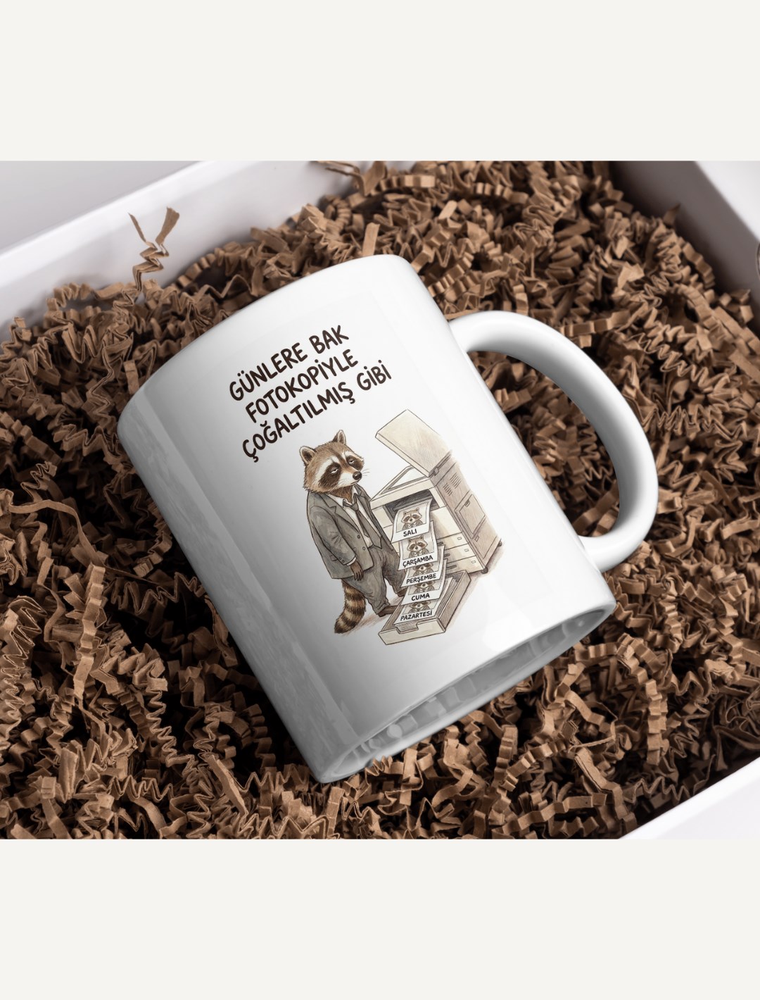 Pazartesi, Salı, Çarşamba… Hepsi birbirinin aynısı mı geliyor? Takım elbisesi içinde, fotokopi makinesinden çıkan “aynı günleri” hüzünle izleyen bu sevimli rakun, plaza hayatının ve rutinin en dürüst temsilcisi. Makineden çıkan kağıtlarda her gün için kendi yorgun suratını gören bu rakun, ofis masanızdaki en samimi dostunuz olacak.