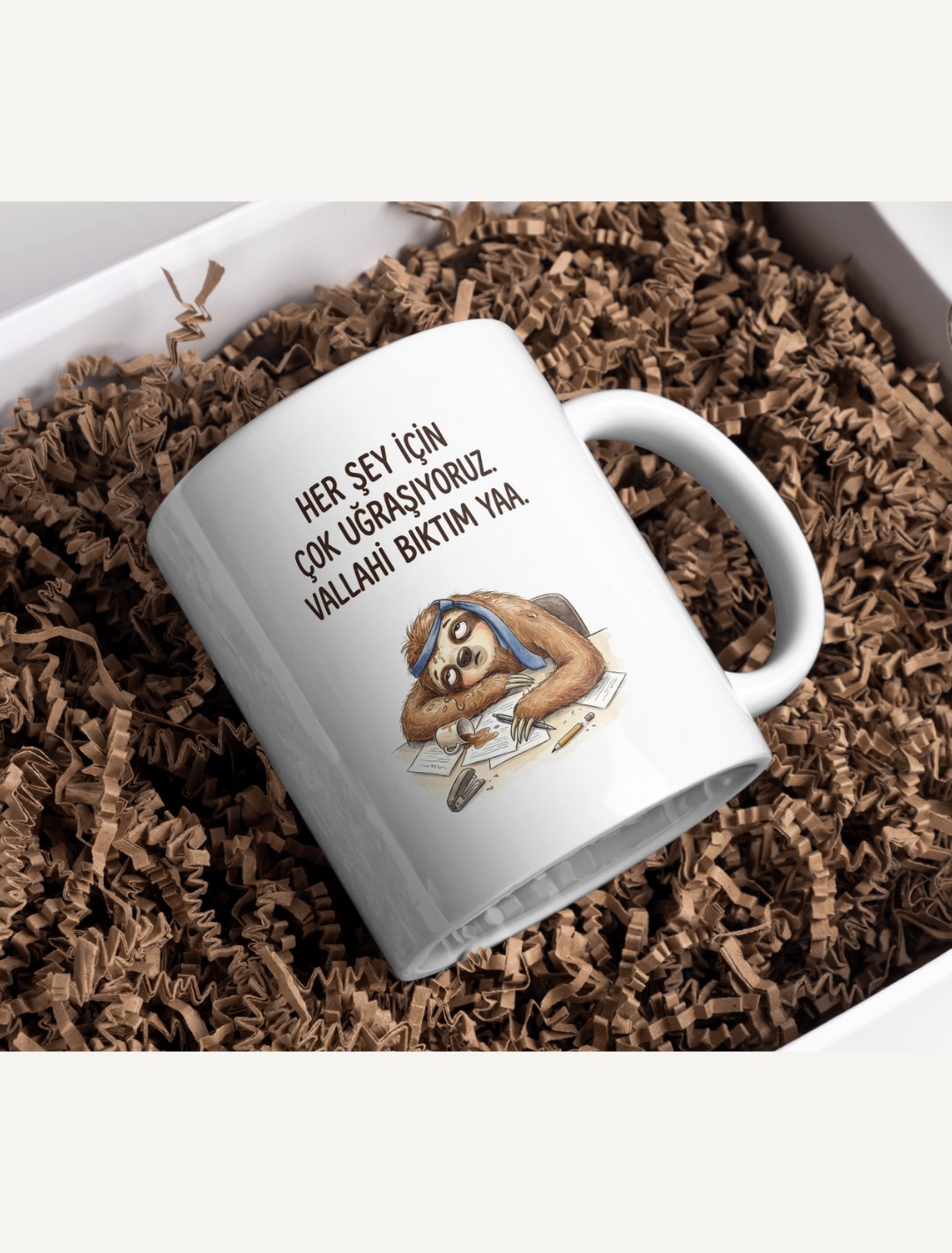Sürekli bir şeylere yetişmeye çalışmaktan, bitmeyen dosyalardan ve her detaya efor sarf etmekten yorulanlar için günün özeti bu kupada! Başına bağladığı mavi bandanası, masaya saçılmış kağıtları, devrilmiş kahvesi ve dökülmüş kalemiyle bu tembel hayvan, modern plaza hayatının “tükenmişlik” abidesi gibi duruyor. Masa başında “benim burada ne işim var?” diye sorgulayan her çalışanın ruh halini yansıtan en dürüst tasarım.