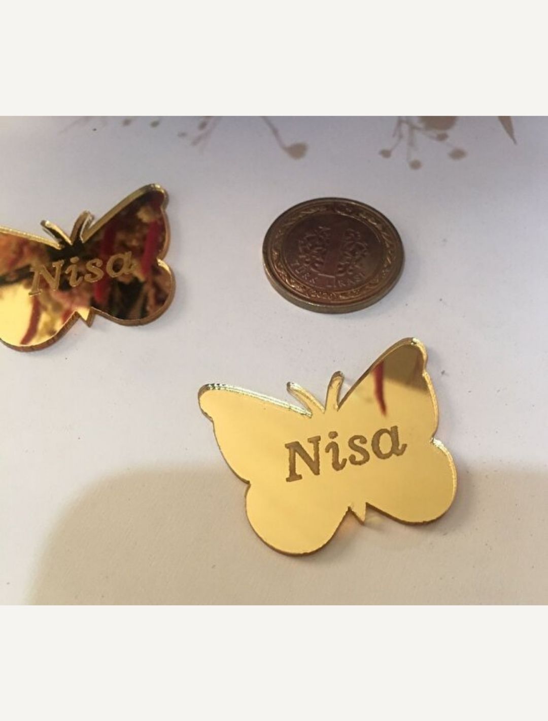 - Davetlerinize zarafet ve ışıltı katacak, her biri isme özel tasarlanan bu kelebeklerle tanışın. Altın ayna pleksinin göz alıcı yansıması, bu küçük dokunuşu unutulmaz bir hatıraya dönüştürür. Söz, nişan, mevlüt veya doğum günü gibi özel anlarınızda misafirlerinize bırakacağınız en zarif iz.